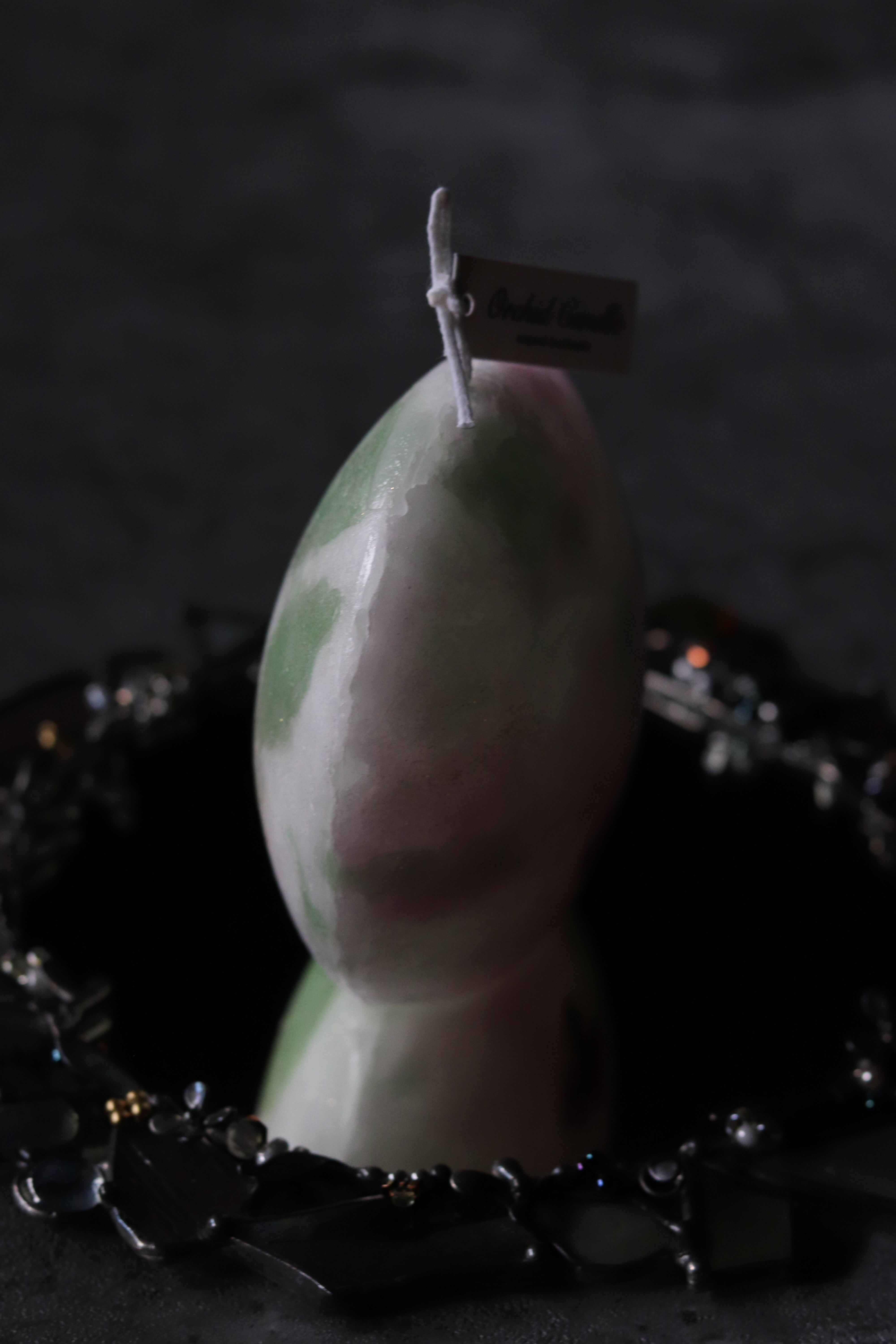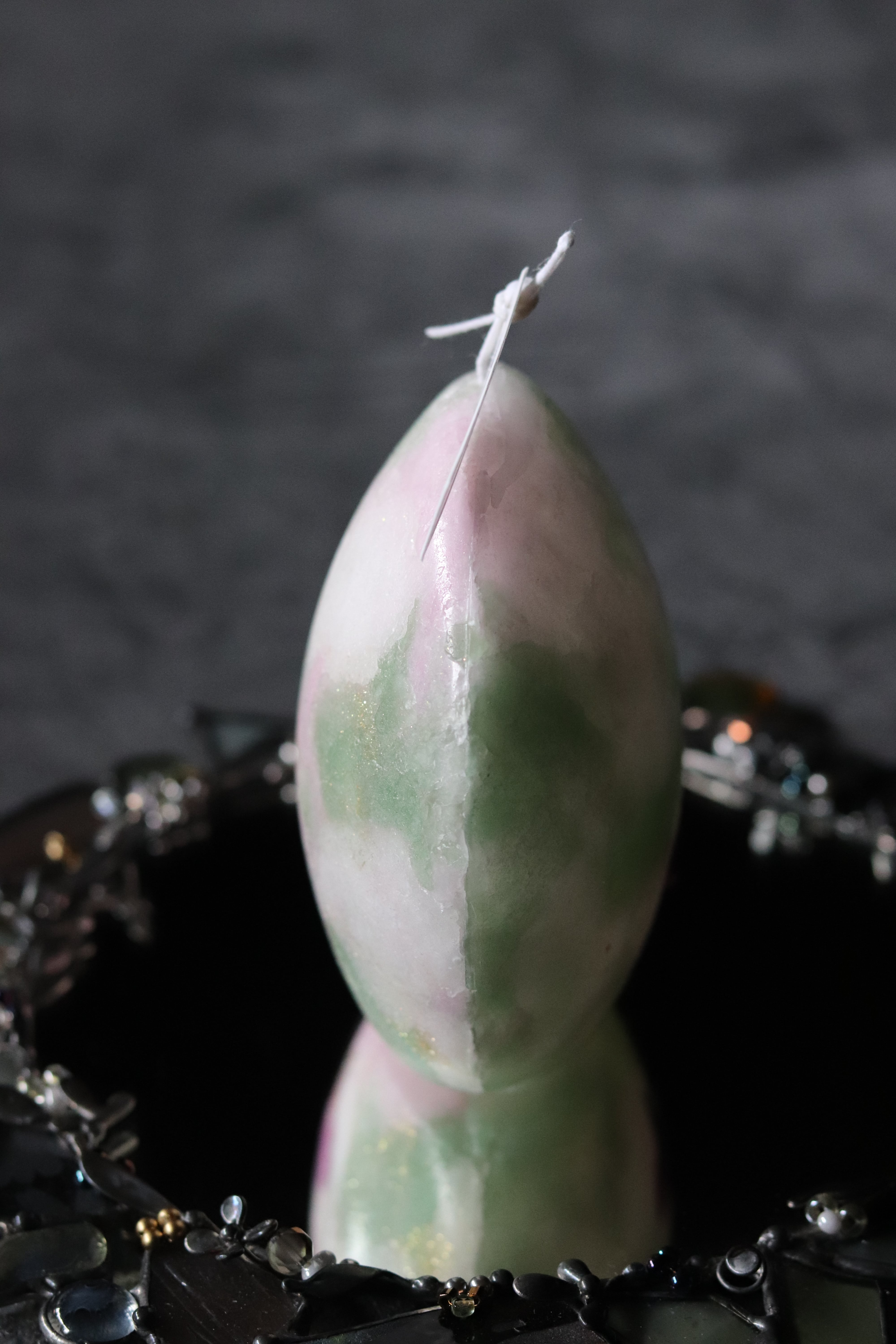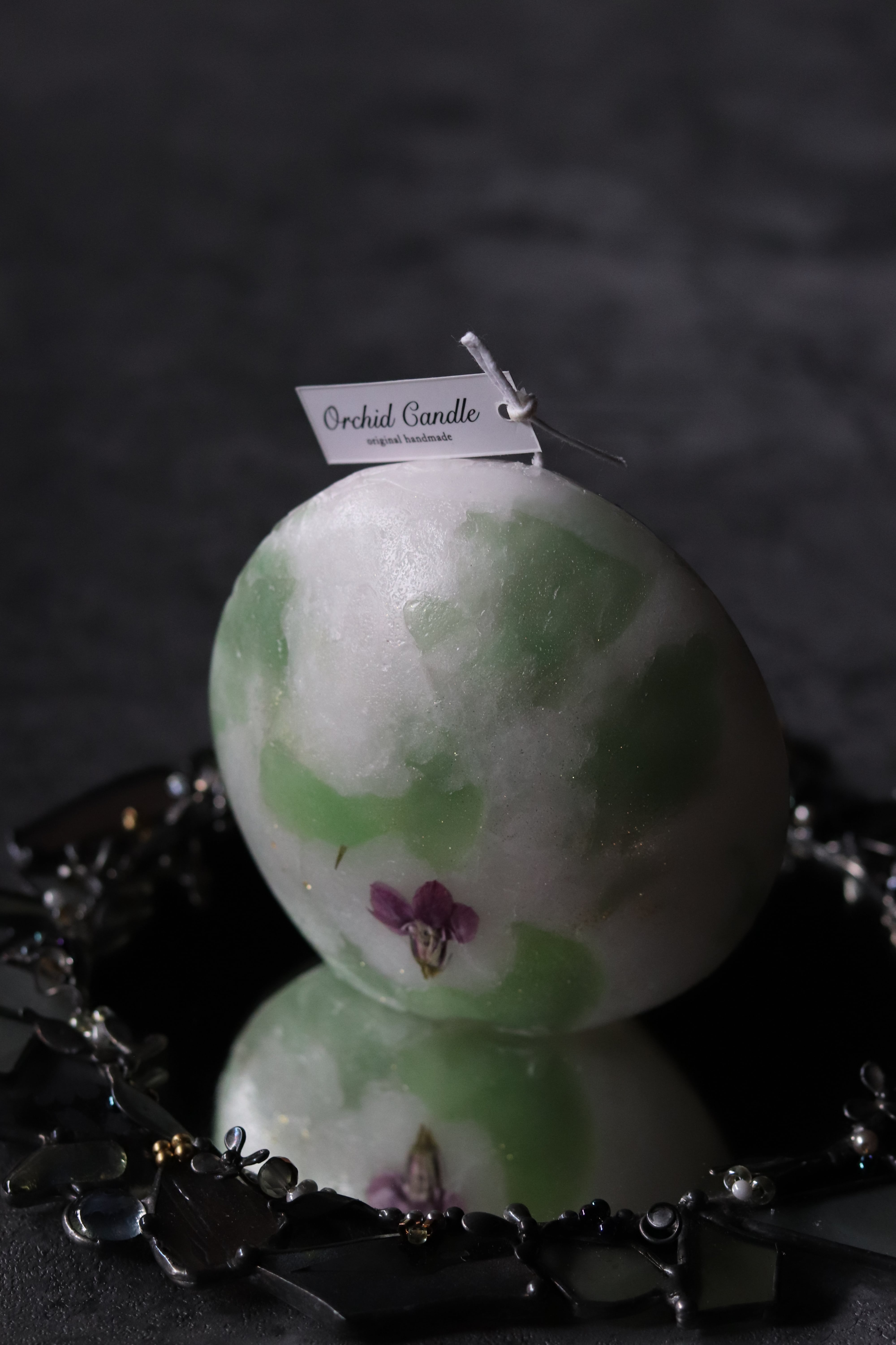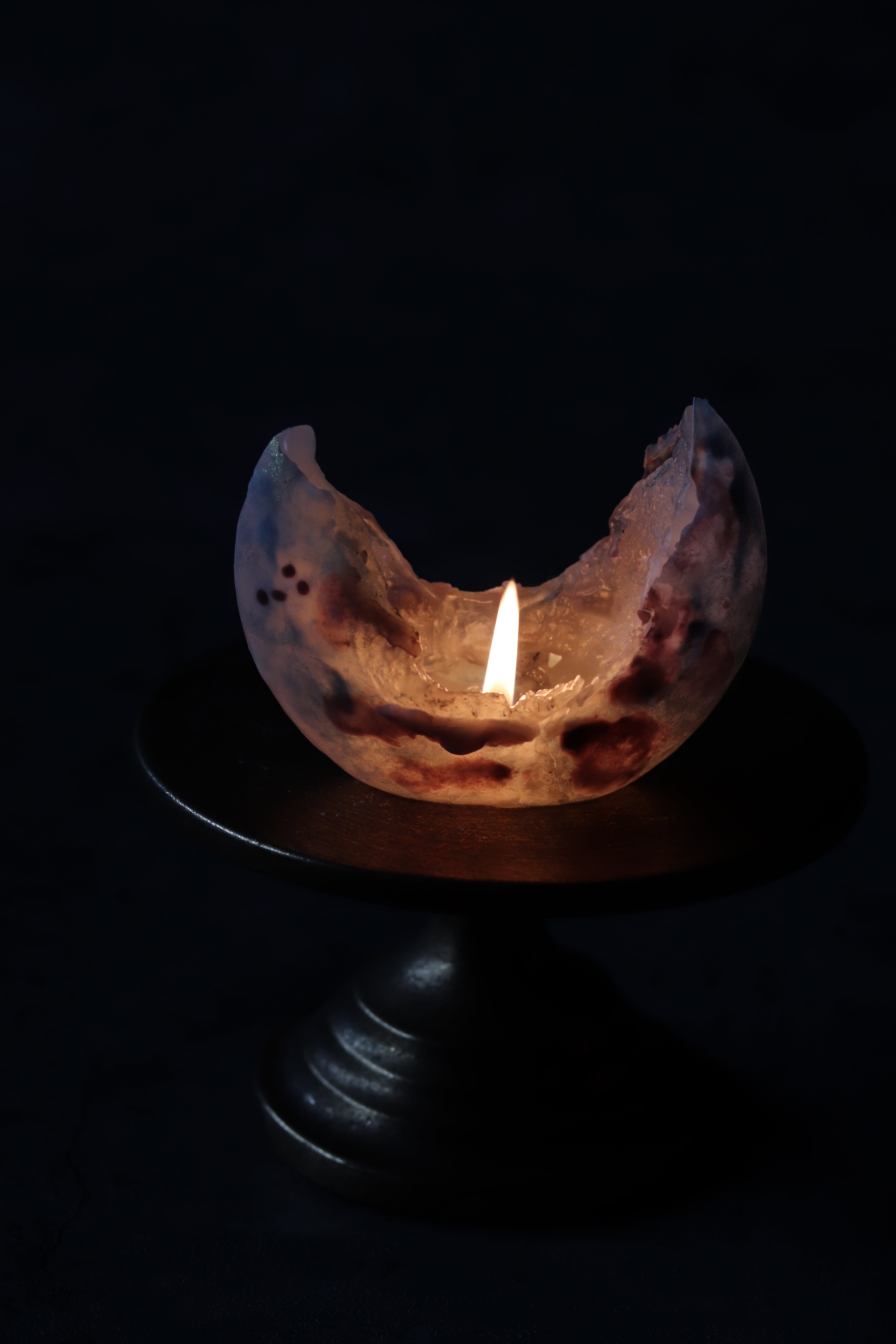 マーブル模様に押し花をアクセントし、お上品さを演出します。火を灯すことで、溶け進むごとに三日月のフォルムが現れ、移ろう表情をお楽しみいただけます。